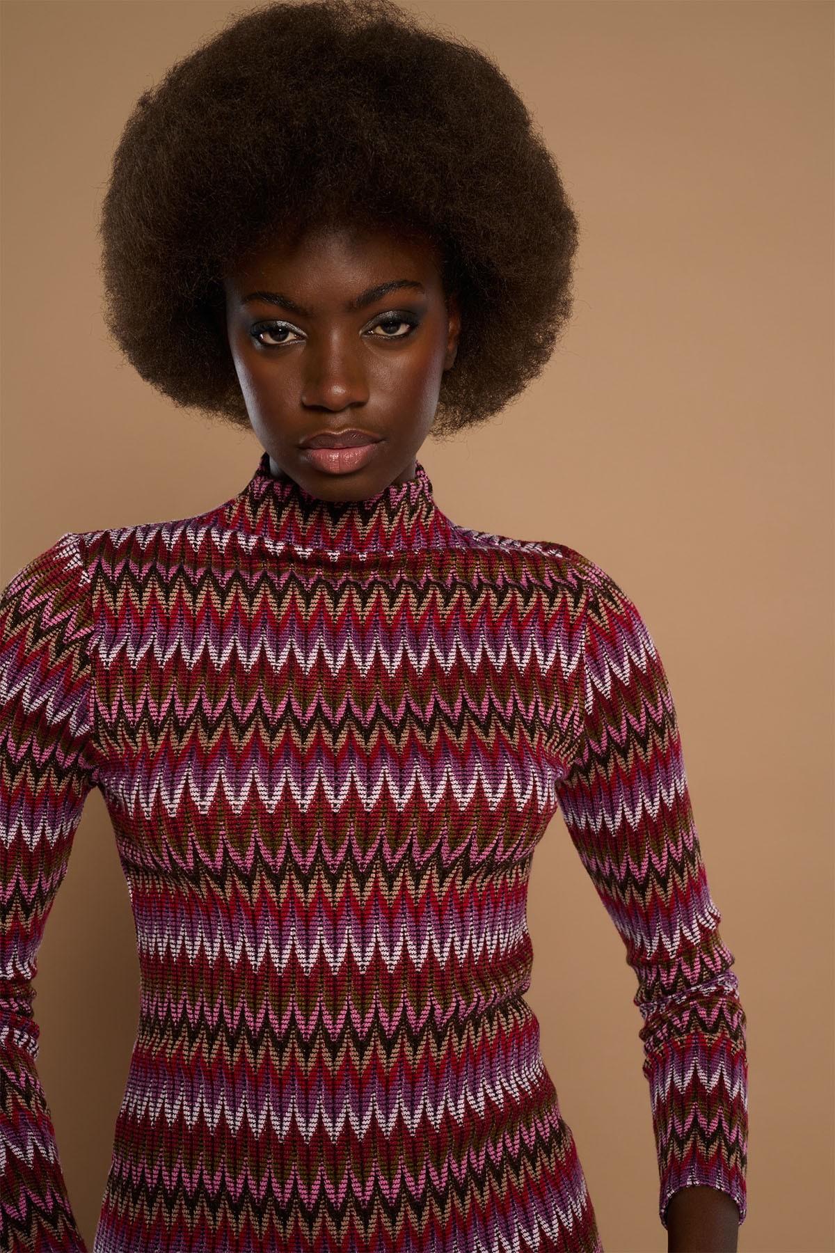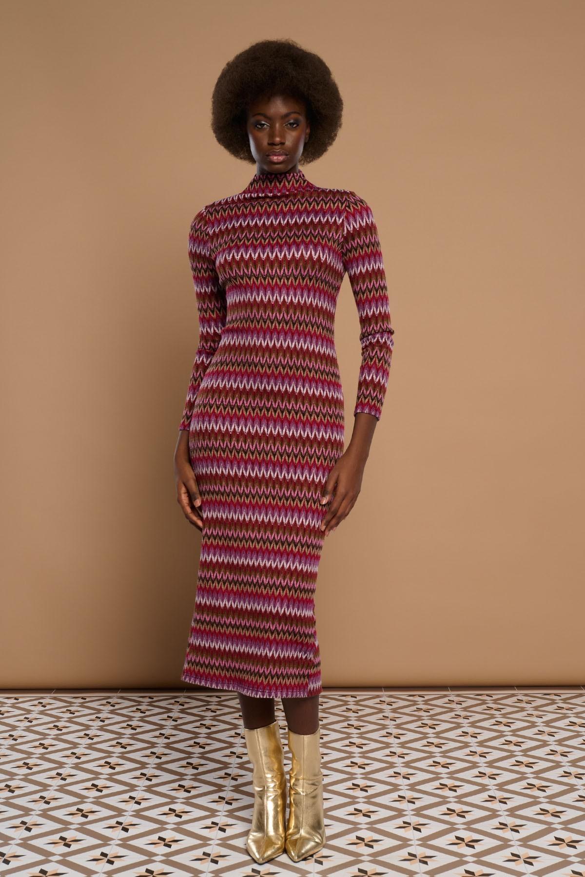 Vestido de cuello alto y manga larga. Tejido elástico. Estampado zigzag. Forro interior elástico.