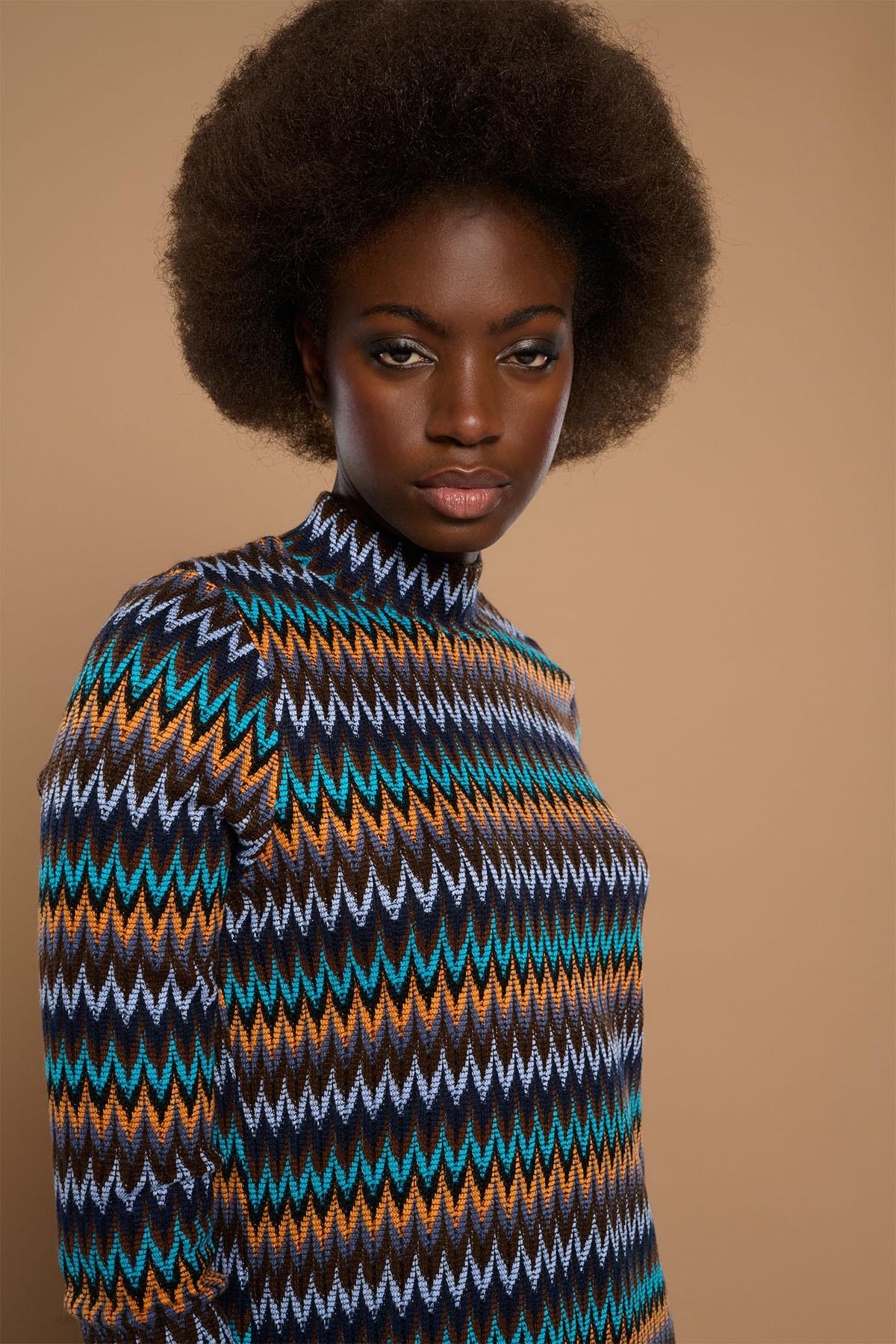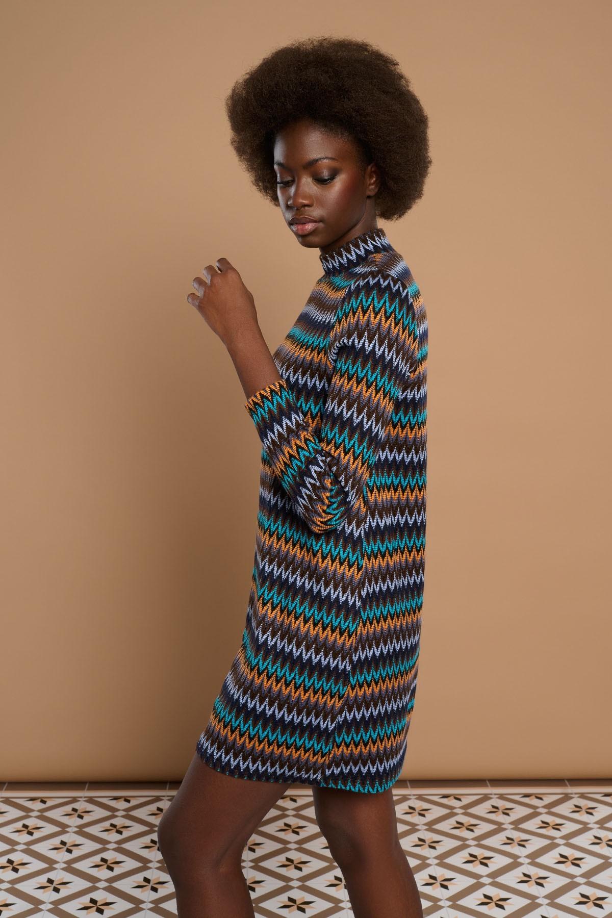 Vestido corto de cuello perkins y manga larga. Estampado zigzag. Tejido elástico. Forro interior elástico.