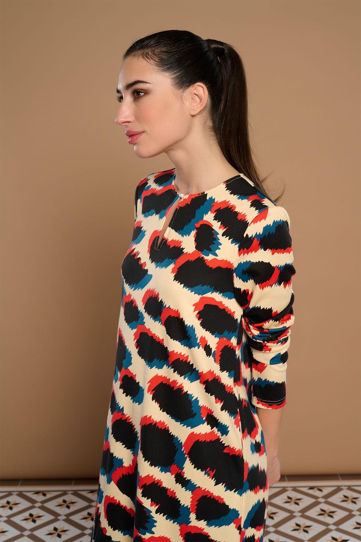 Vestido corto de cuello redondo y escote en lágrima con botón. Manga larga. Bolsillos laterales. Forro interior.