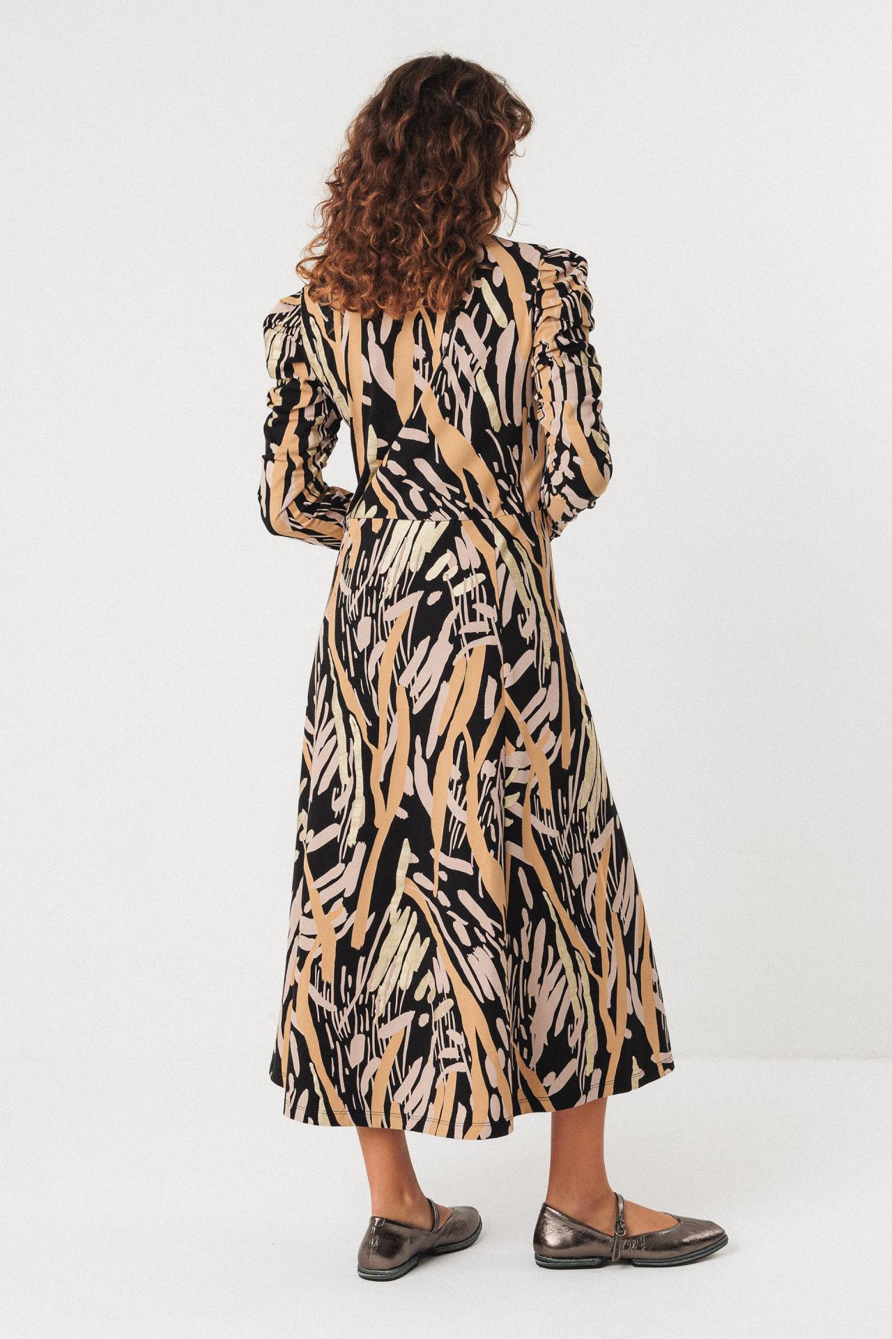 Vestido midi de algodón orgánico stretch. Tiene las mangas largas con unos frunces en los hombros y la falda acampanada.