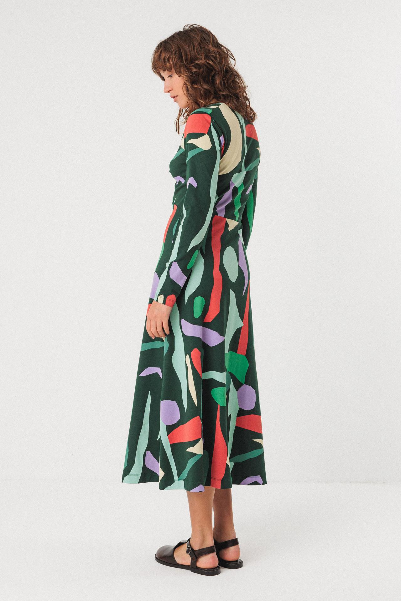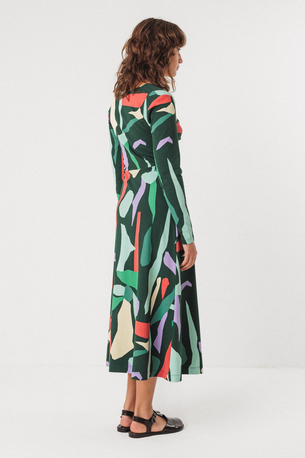 Vestido midi de algodón orgánico stretch. Es de manga larga y tiene el cuello de pico.