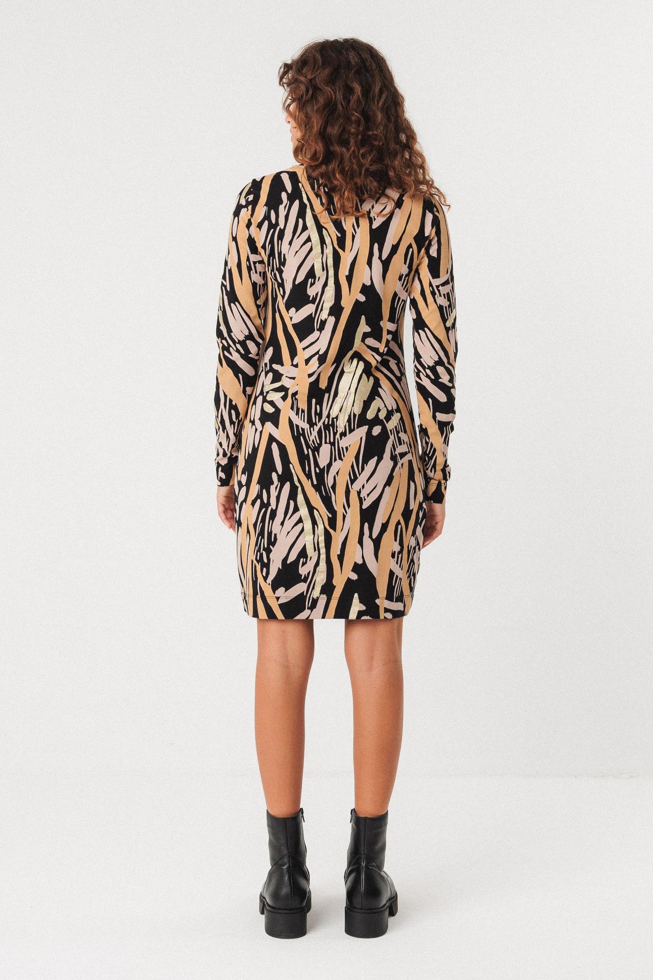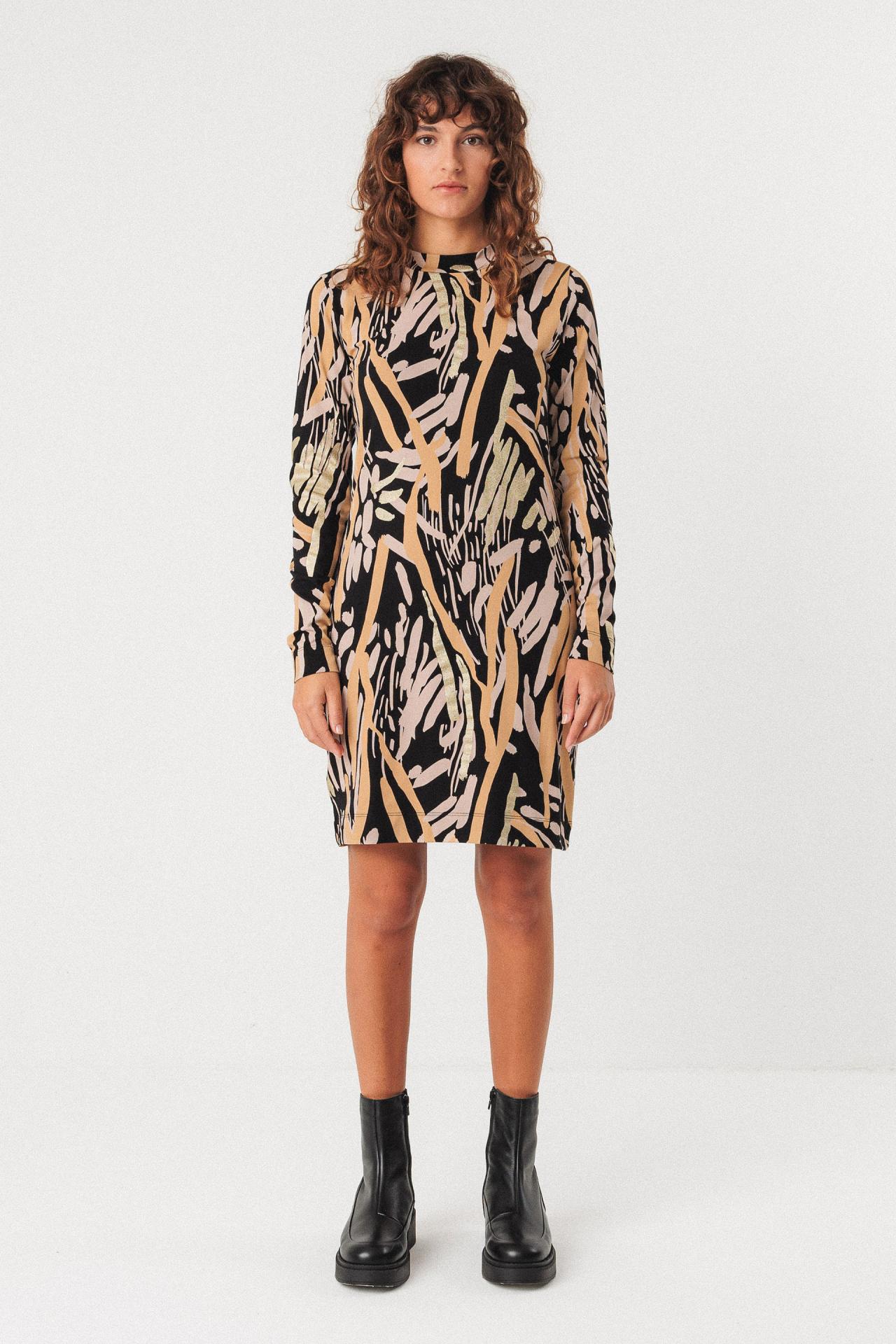 Vestido ceñido corto de algodón orgánico stretch de manga larga y cuello alto. Fácil de poner.