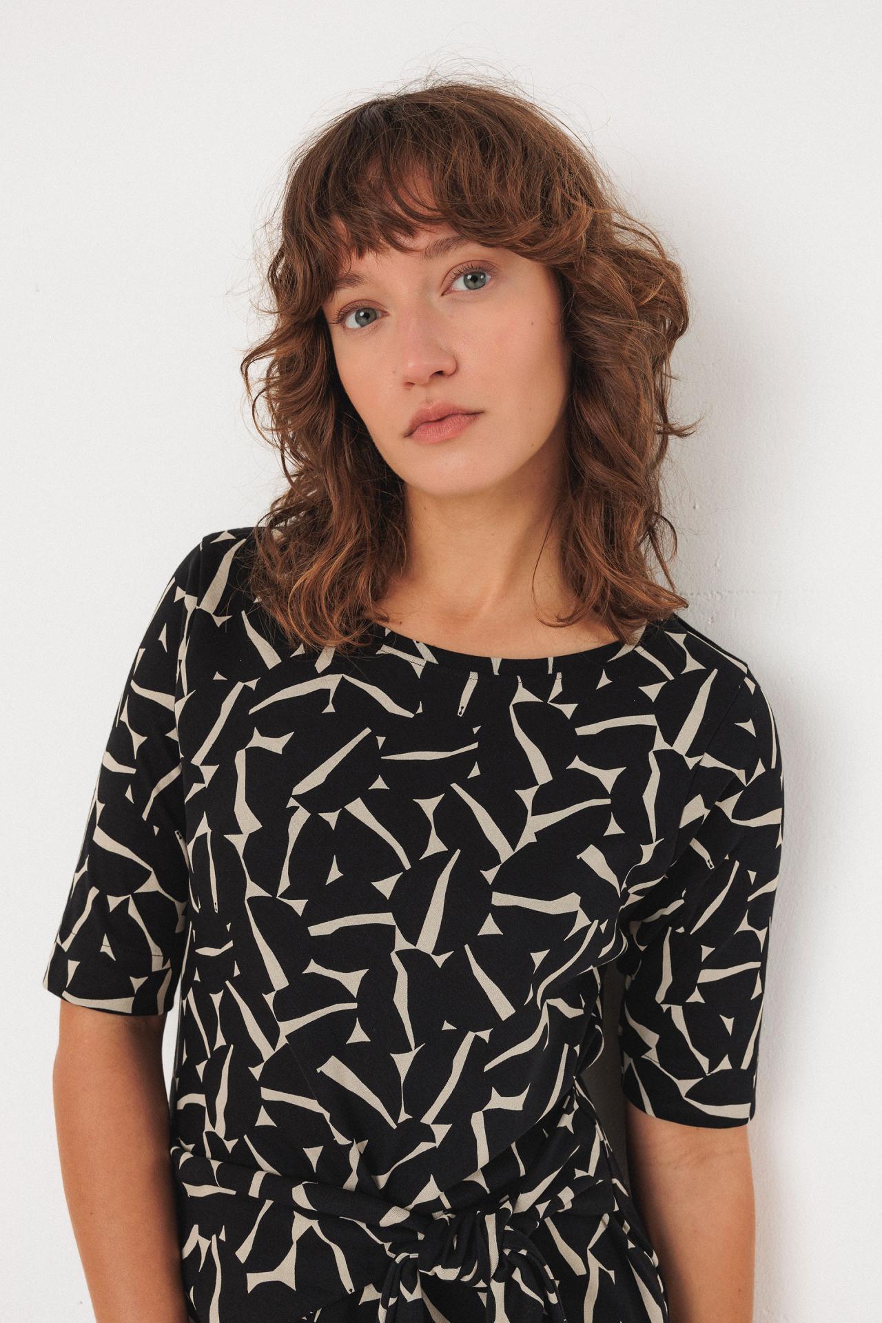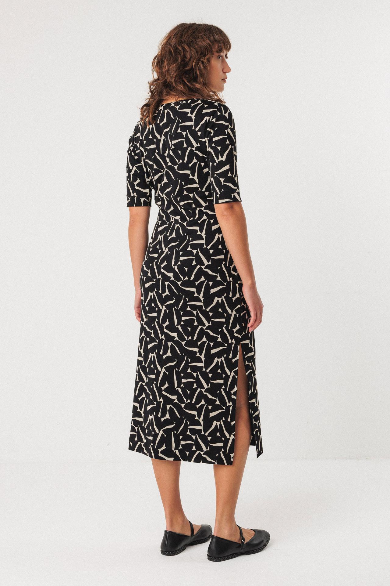 Vestido midi ceñido con cuello barco, de manga corta y con un detalle anudado en la parte delantera. Se pone fácilmente y tiene unas aperturas en la parte baja de los laterales para mayor comodidad.