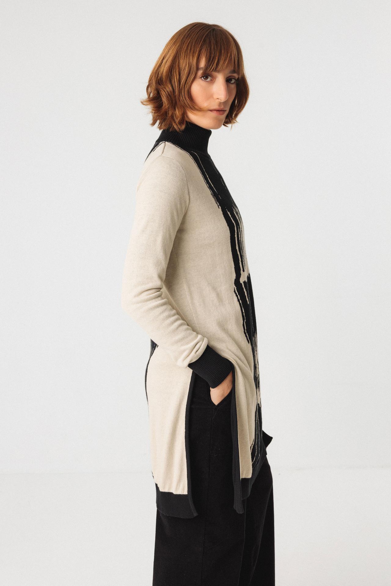 Suéter largo de punto fino con un dibujo jacquard estructurado y cuello alto. Llega por encima de la rodilla y tiene unas aberturas largas en los laterales.