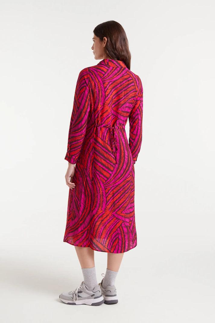 Vestido midi de tejido crepé ligero con estampado Fedora. Cuello solapa con manga larga con puño con botón. Cierre frontal con botones y cintura ajustable con cordón en la parte trasera. Bolsillos laterales. La modelo mide 177 cm y lleva talla S.