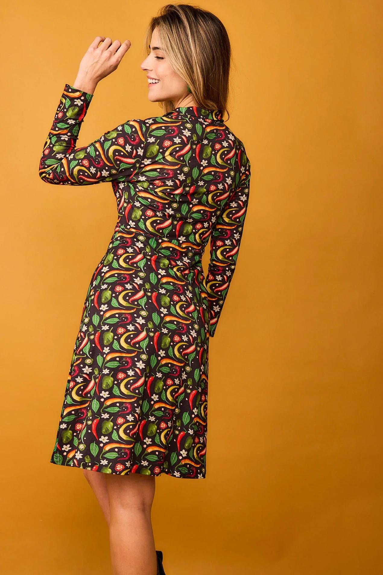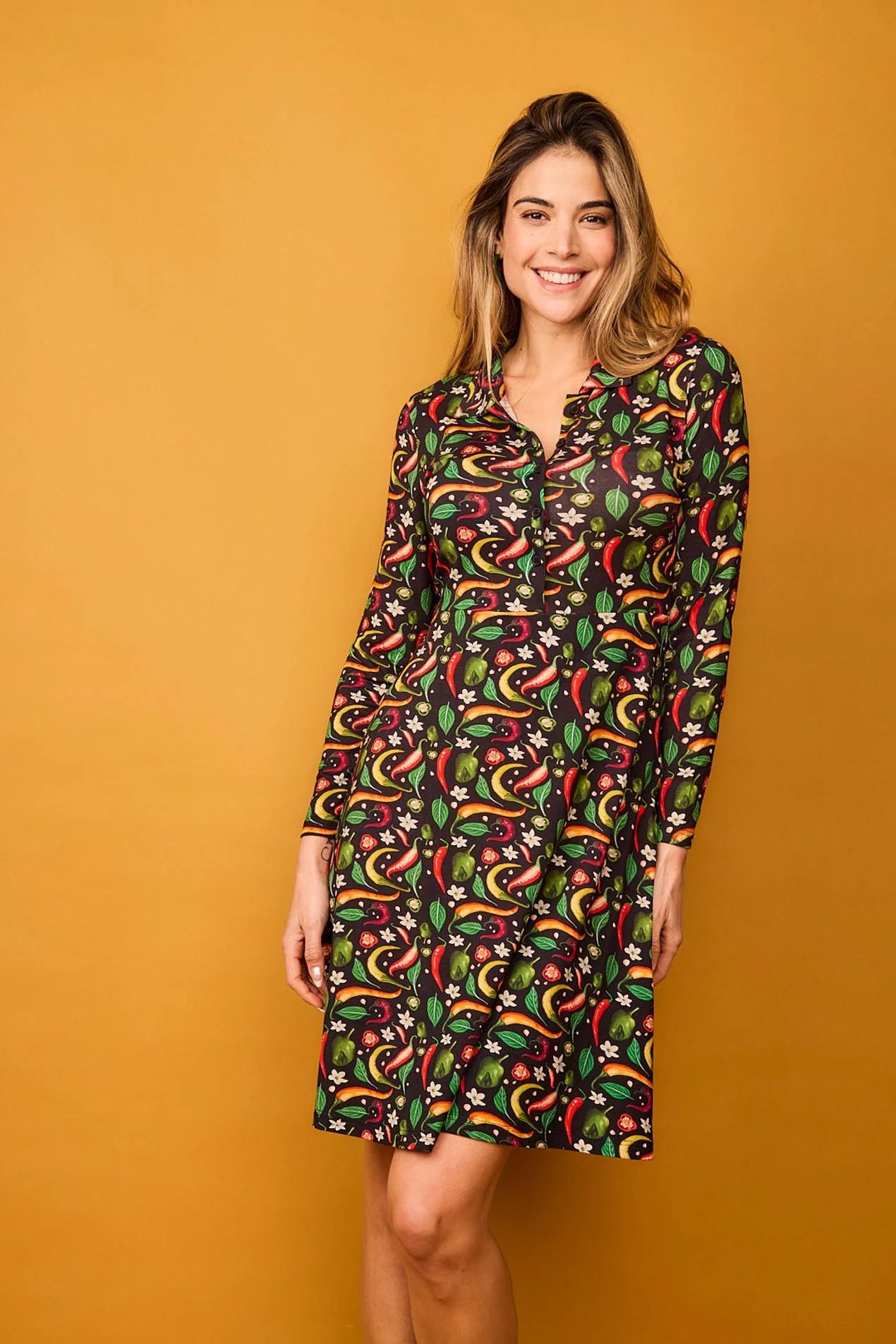 Vestido corto con cuellos y botones hasta la cintura, es elástica la tela y se ajusta a cualquier cuerpo. Sienta espectacular.